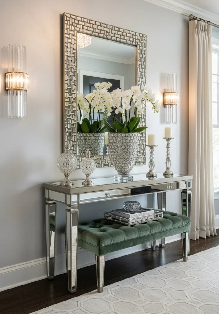 Glam Entryway with Mirrored Console Table and Crystal Decor