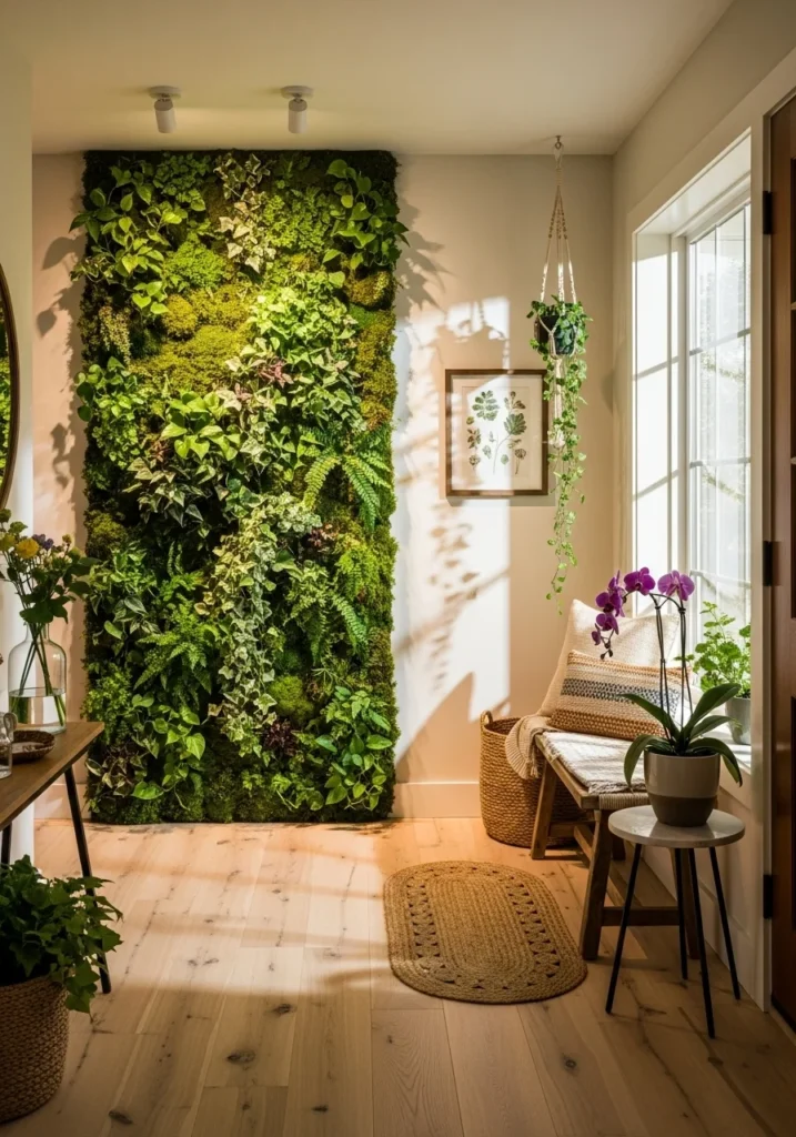 A greenery-filled entryway with a vertical garden wall transforms the entrance into a vibrant oasis. The lush wall of plants instantly draws attention, infusing the area with freshness, color, and texture. It creates a natural focal point that blurs the line between indoor and outdoor living.