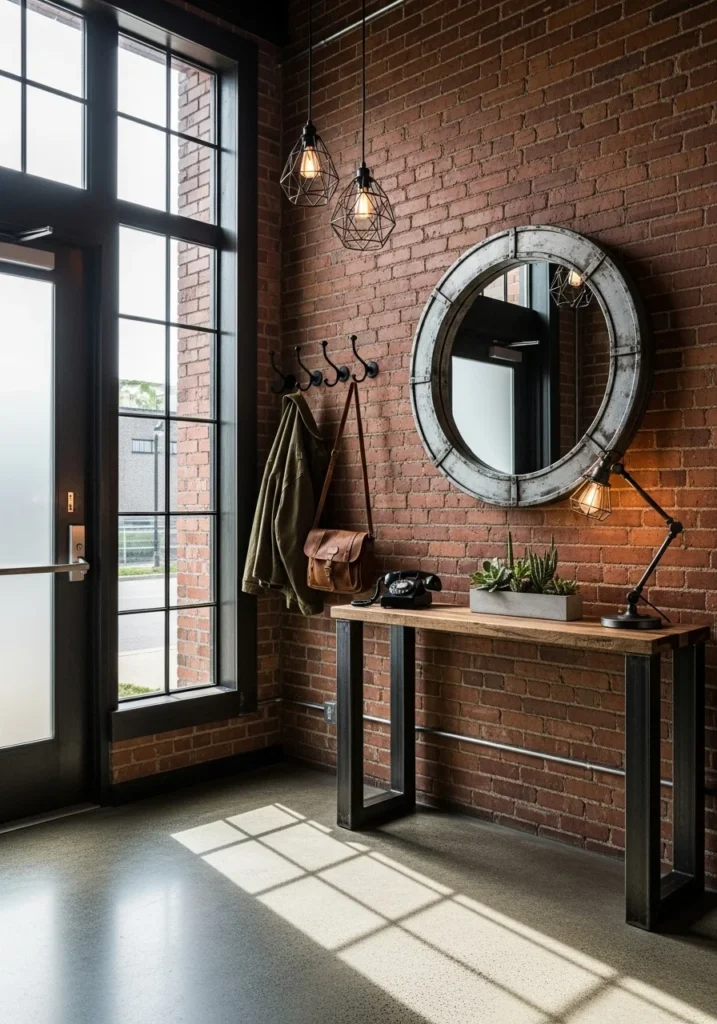 An industrial-style entryway is bold, raw, and effortlessly stylish. Exposed brick walls create a textured backdrop, while black metal accents and reclaimed wood details add strength and character. The result is a design that feels urban yet grounded.