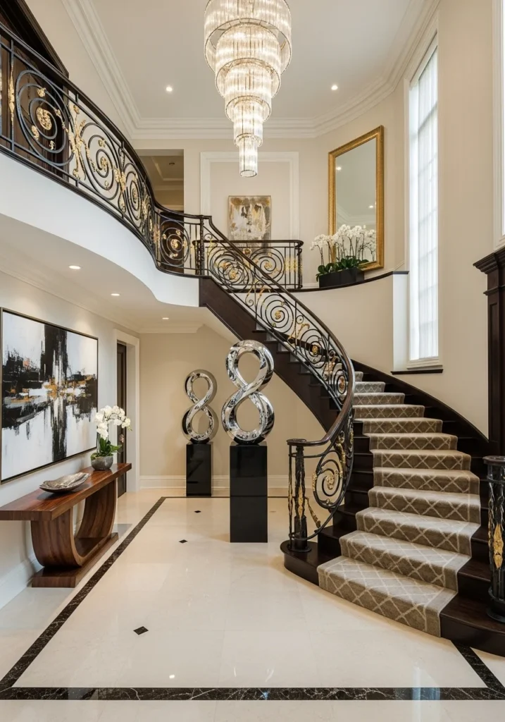 Lighting plays a crucial role — chandeliers or recessed fixtures highlight the staircase’s graceful lines. The overall ambiance is sophisticated yet welcoming, turning the foyer into a gallery-like space that celebrates design and artistry.