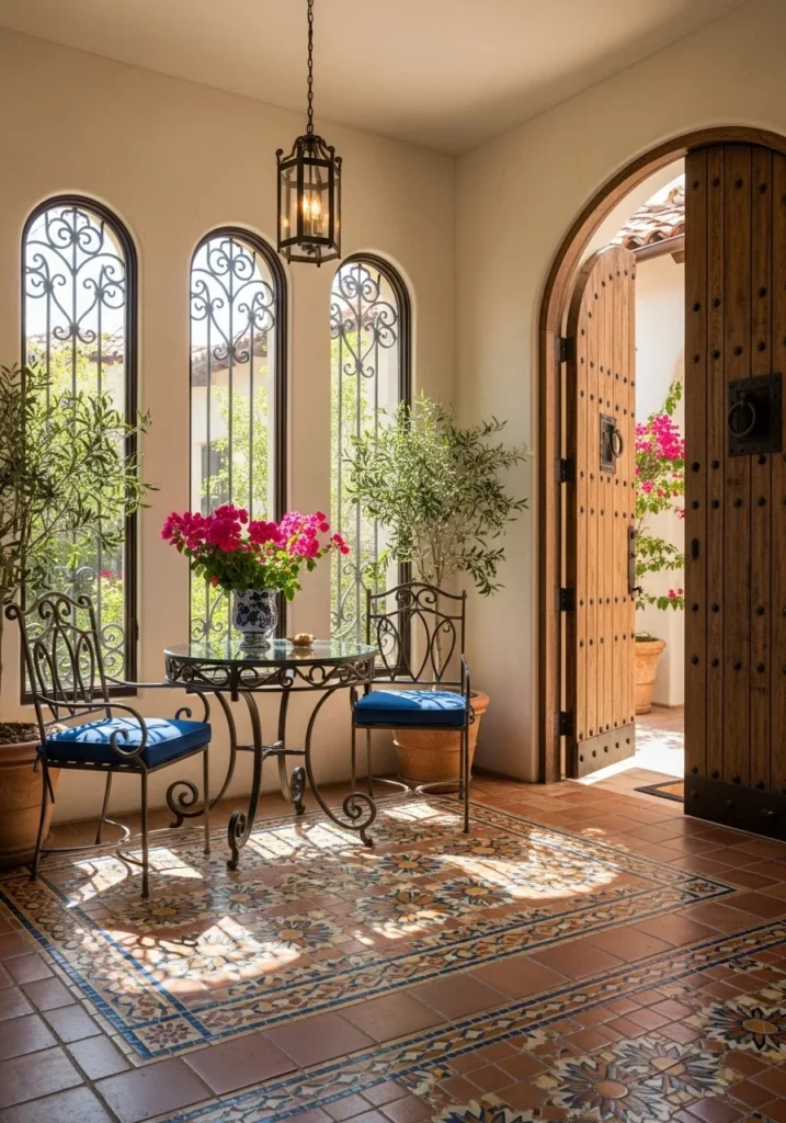 A Mediterranean-inspired entrance evokes sunshine, craftsmanship, and natural beauty. Patterned tile flooring introduces artistry and warmth, while arched windows flood the space with golden light. Every element celebrates regional heritage and easy elegance.