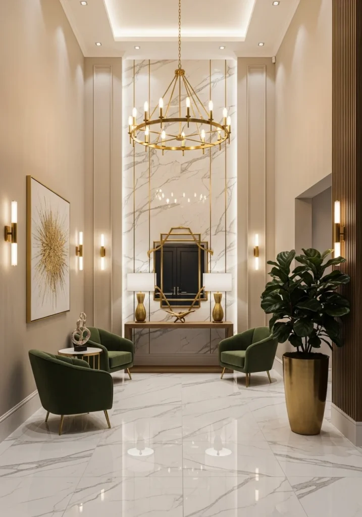 Modern Luxury Entryway with Marble Accents and Gold Lighting Fixtures