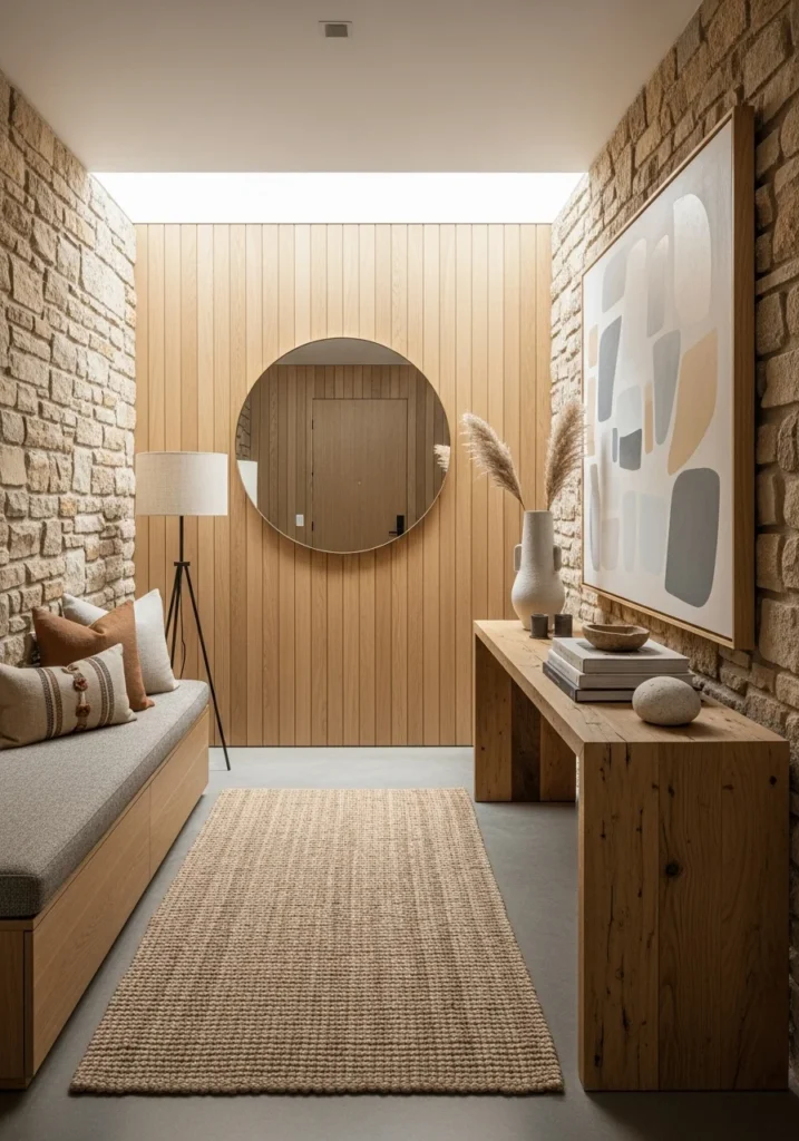 Minimalist furniture and natural fabrics such as linen or jute help maintain visual balance. With earthy tones, handcrafted pieces, and soft ambient lighting, this entryway design becomes a serene, welcoming space that radiates comfort and grounded elegance.