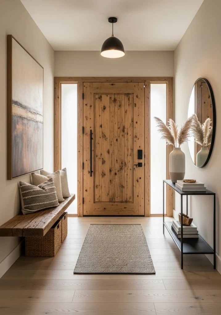 To enhance the modern touch, integrate black metal accents, modern lighting, or minimalist artwork. The result is a beautifully balanced entryway — grounded in rustic comfort yet elevated by modern simplicity.