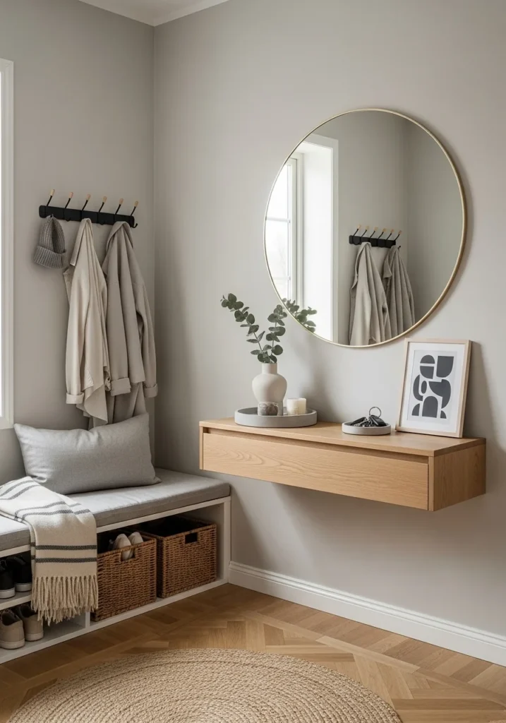 Wall hooks replace bulky furniture, offering practical storage while maintaining an open, airy layout. A small bench or floating shelf adds convenience without crowding the space. Neutral colors — such as warm whites, taupe, or beige — foster a sense of calm and serenity.