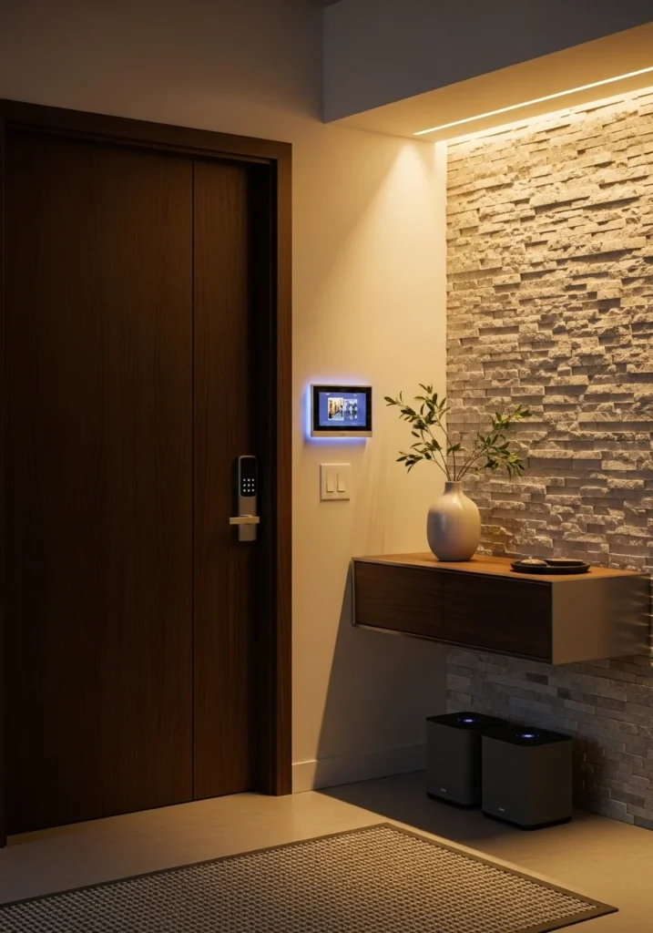 A smart home entryway represents the future of modern living — combining technology, elegance, and security. Keyless entry systems eliminate the hassle of keys, while integrated lighting control ensures the perfect ambiance with a single touch or voice command.