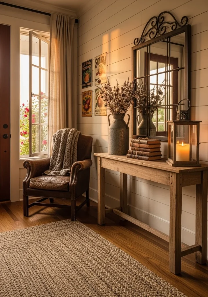 A vintage farmhouse entrance combines timeless rustic charm with nostalgic character. Distressed wood furniture — whether a console, bench, or cabinet — adds texture and history to the design, telling a story of craftsmanship and authenticity. The space feels lived-in, warm, and inviting.