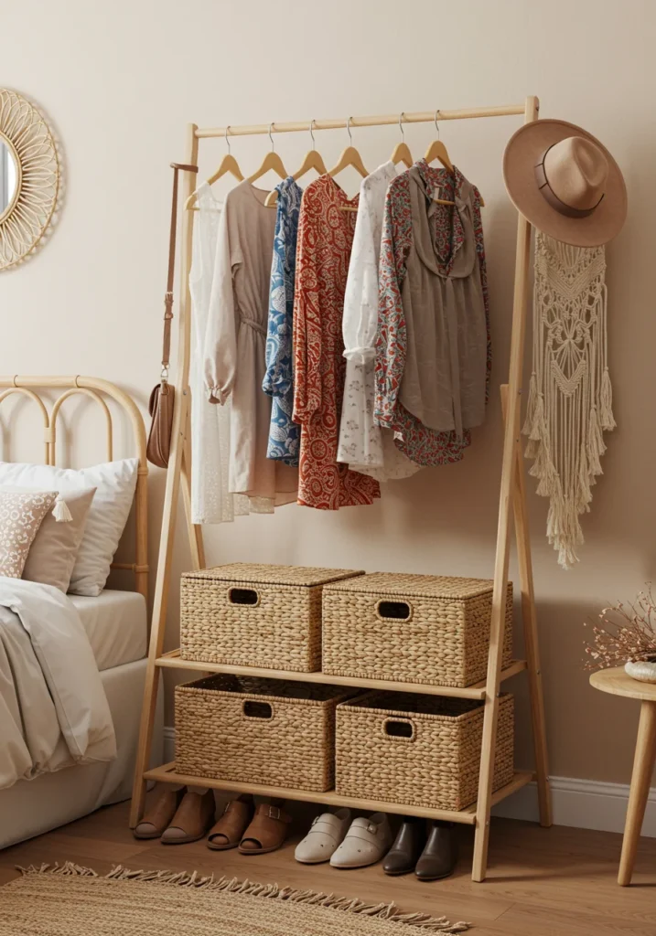 A boho-style open clothing rack with woven baskets is both practical and decorative, making it a great fit for small bedrooms. The open rack keeps clothing visible and easily accessible, while the baskets beneath provide concealed storage for shoes, accessories, or folded items. Woven baskets, whether rattan or seagrass, bring natural texture and warmth, enhancing the relaxed bohemian aesthetic. This type of closet solution is lightweight, affordable, and easy to rearrange, making it perfect for renters or those who enjoy frequently updating their décor. Open racks also encourage mindful organization since items are always on display, reducing clutter and highlighting favorite pieces. String lights, plants, or decorative textiles can be added to the setup for extra charm. Unlike bulky wardrobes, this system feels airy and unrestrictive, creating the illusion of more space in small bedrooms. A boho-inspired clothing rack with baskets balances functionality and style, turning everyday storage into a cozy, personalized design element.