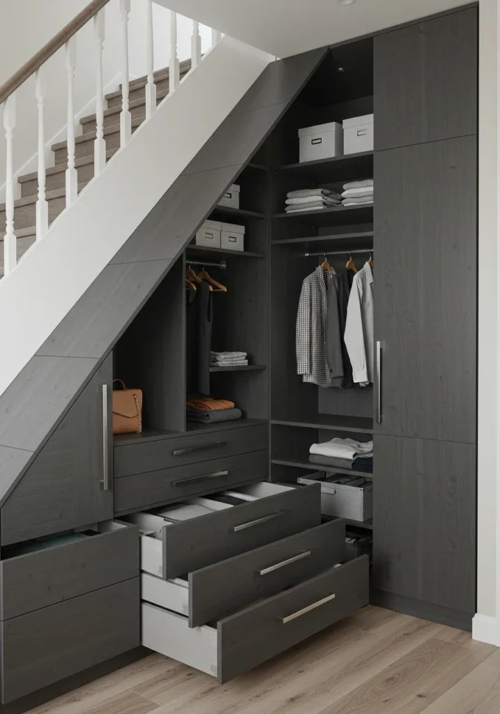 Built-in under-stair wardrobe for tiny bedroom spaces