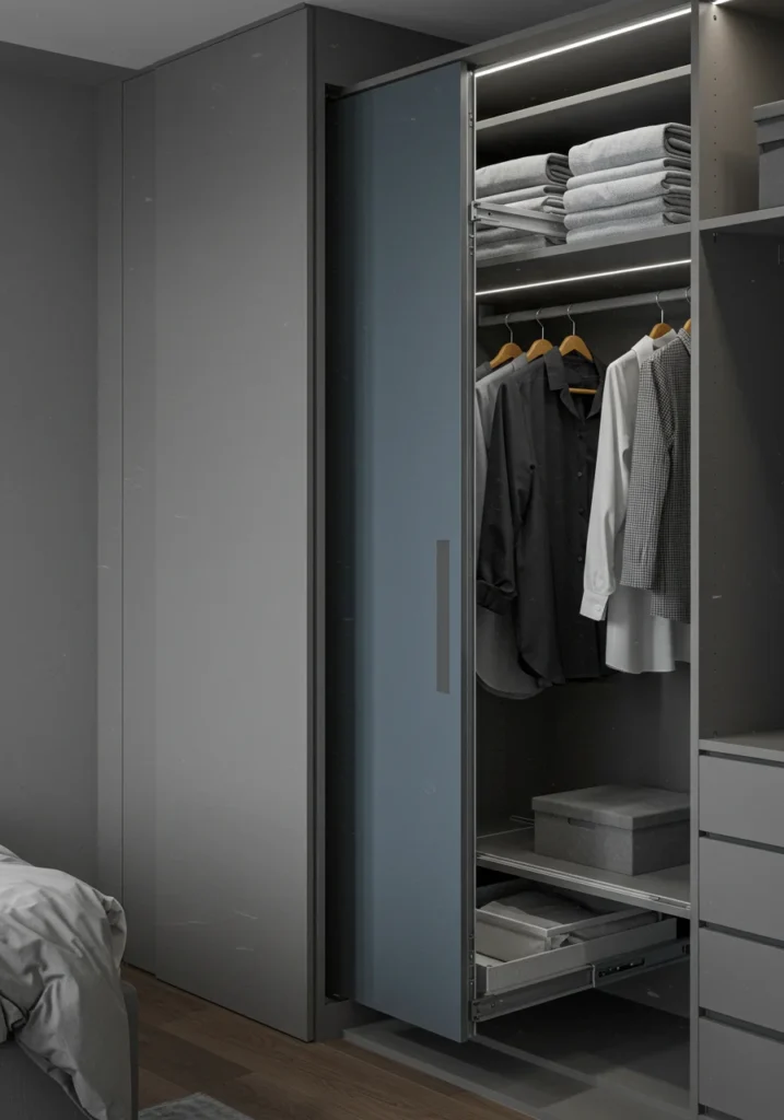 A slim hallway-style wardrobe with sliding barn doors is a rustic yet modern storage solution ideal for narrow bedrooms. Unlike traditional hinged doors, barn doors slide smoothly along a track, saving space while adding a design statement. The wardrobe itself is slim, designed to fit against walls without overwhelming the room. Inside, it can include shelving, rods, and drawers tailored to small-space needs. The barn doors provide a charming farmhouse or industrial aesthetic depending on the material—wood for a cozy, rustic look or metal accents for a modern vibe. Frosted glass or painted finishes can be used for added personality. This type of wardrobe is especially practical in long, narrow bedrooms where swing doors would block pathways. Beyond functionality, sliding barn doors bring texture and visual interest to the space, serving as both storage and a decorative feature. With its combination of efficiency, character, and space-saving design, a slim hallway wardrobe with barn doors is perfect for compact bedrooms.