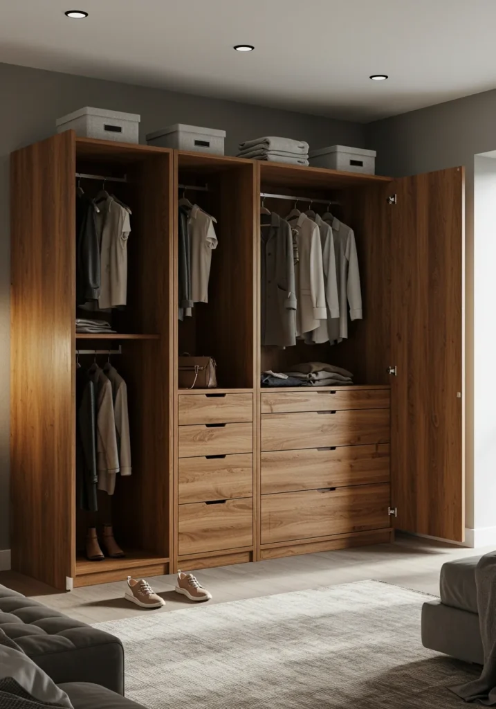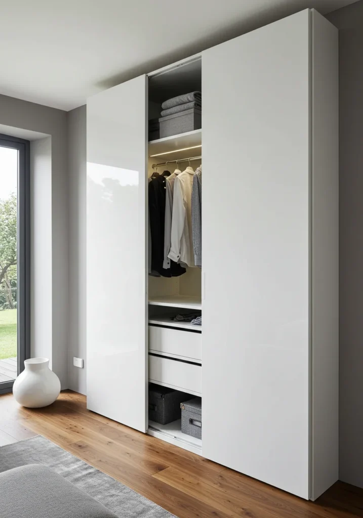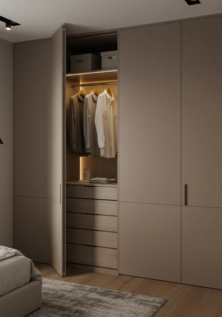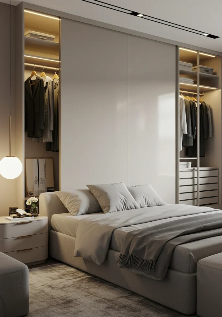 A Scandinavian-inspired compact wardrobe is perfect for small bedrooms where simplicity and functionality are key. Light wood finishes, clean lines, and minimal hardware give the wardrobe an airy, calming feel, making the room seem larger and brighter. These wardrobes often combine open shelving with concealed storage, creating balance between accessibility and tidiness. Slim profiles and neutral tones ensure the closet blends seamlessly into the décor rather than dominating the space. Inside, you can add smart organizers such as pull-out drawers, rods at different heights, and modular boxes for accessories. Many Scandinavian designs also emphasize eco-friendly, sustainable materials, adding an extra layer of value. This wardrobe style pairs beautifully with neutral or pastel color palettes, natural textiles, and uncluttered layouts. The combination of functionality and understated elegance makes it a timeless choice for compact bedrooms. A Scandinavian compact wardrobe proves that small spaces can feel both organized and stylish, without sacrificing comfort or warmth.