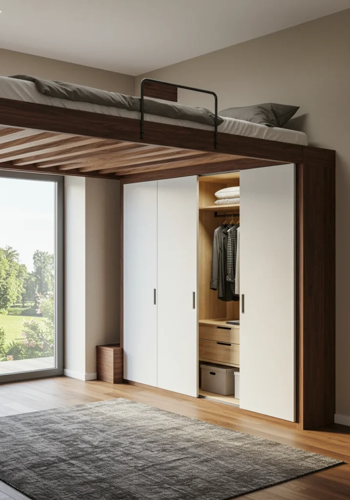 A closet integrated into a lofted bed structure is one of the smartest space-saving solutions for small bedrooms. By elevating the bed, the space beneath becomes a fully functional closet area, complete with hanging rods, shelves, and drawers. This design maximizes vertical space, leaving the rest of the room free for other furniture or activities. The closet beneath can be open or concealed with sliding doors, curtains, or panels, depending on preference. It’s particularly effective in studio apartments, kids’ rooms, or shared bedrooms where every inch matters. The lofted design can also include a built-in desk, creating a multifunctional sleeping and storage zone. With modern finishes and thoughtful layouts, these structures feel sleek and intentional rather than bulky. Integrated lighting and modular configurations add convenience and flexibility. By combining a bed with a closet, this solution eliminates the need for a separate wardrobe, making it one of the most efficient and stylish ways to maximize storage in small bedrooms.