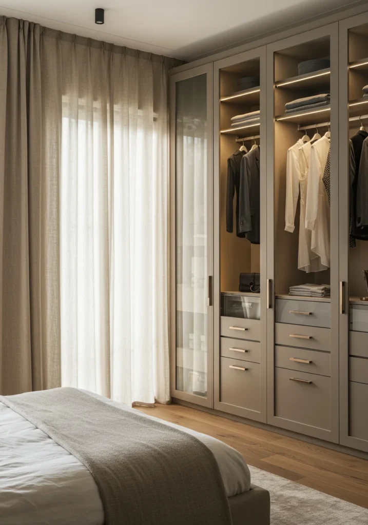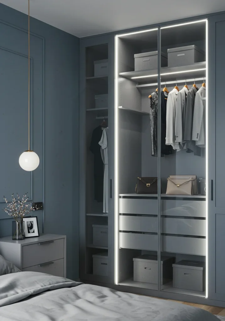A glass-door closet with LED lighting brings a touch of modern sophistication to small bedrooms while also creating a sense of openness. The transparent or frosted glass panels allow you to display your wardrobe like a boutique, turning clothing and accessories into part of the décor. To prevent the space from looking cluttered, interior organization is key—integrating shelves, drawers, and hanging rods ensures everything stays neat and stylish. LED lighting, often built into the frames or interior, highlights your wardrobe and adds a warm, ambient glow to the room. This feature also makes it easy to locate items, especially in darker corners. The sleek glass panels reflect light, visually expanding the space and making the room feel brighter and more open. Whether you prefer clear glass for a minimalist showcase or frosted glass for a semi-private effect, this design is perfect for modern, chic bedrooms. It blends functionality with elegance, making even small bedrooms feel like luxury suites.