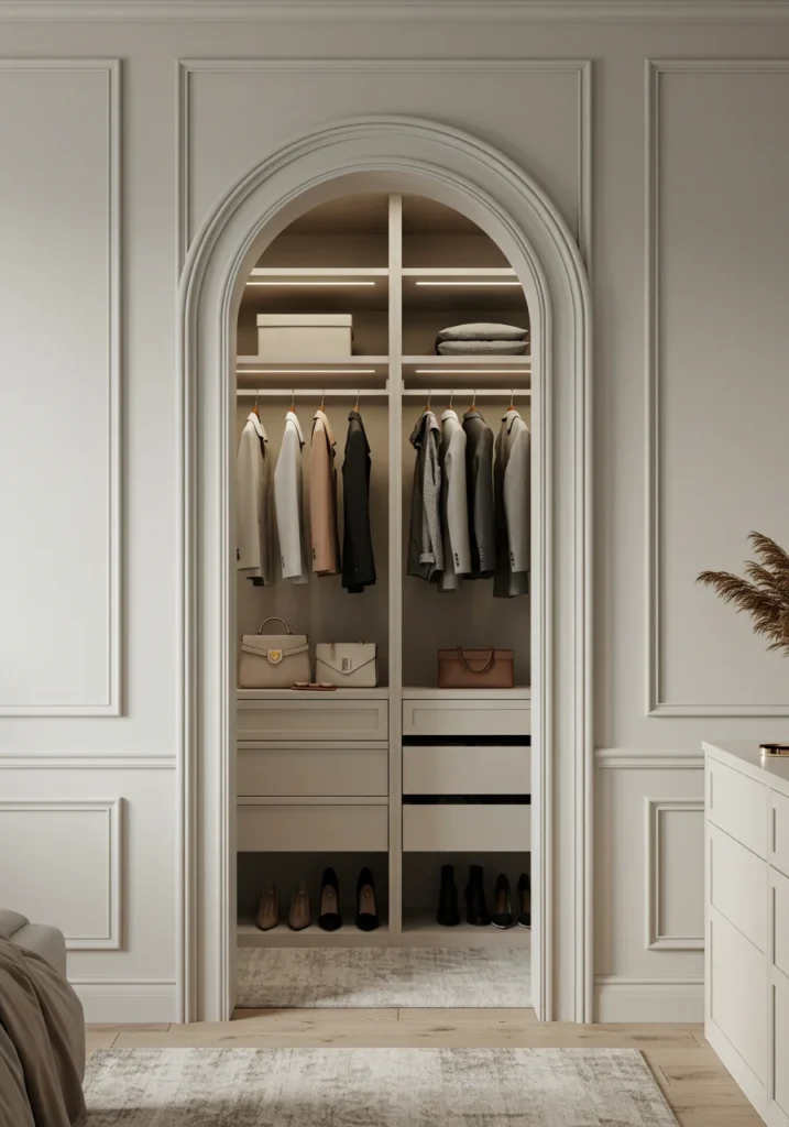 A closet nook with an arched alcove design blends function with architectural charm, making it perfect for small bedrooms that need both storage and style. Instead of standard boxy closets, the arched alcove adds softness and elegance, turning a simple storage area into a feature element of the room. The alcove can house a clothing rack, shelves, or built-in drawers, all neatly tucked within the curved frame. Curtains, sliding panels, or even a statement arch trim can conceal the storage when not in use. This design works beautifully in bohemian, Mediterranean, or eclectic interiors, adding character without taking up additional square footage. The arched shape also creates the illusion of height, making the bedroom feel larger and more open. For added charm, accent lighting can be installed within the alcove to highlight both the closet and the architecture. A closet nook with an arched alcove combines storage efficiency with decorative flair, turning a small bedroom into a stylish and highly personalized retreat.