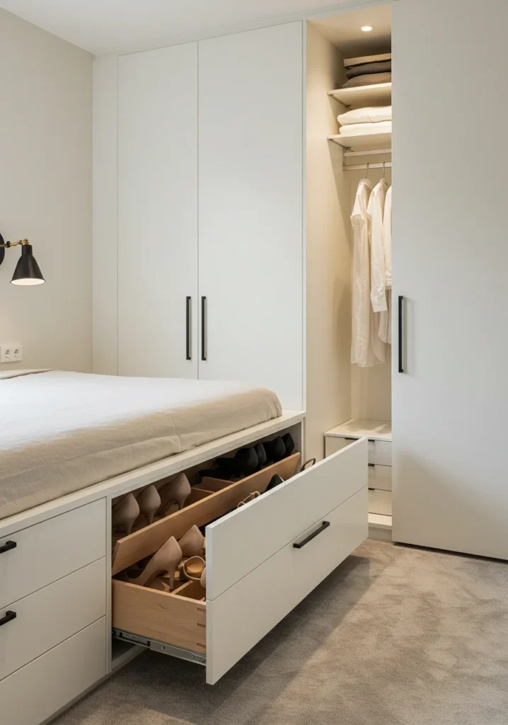 A closet with hidden pull-out shoe drawers beneath the bed is a brilliant space-saving solution for small bedrooms. Instead of dedicating floor space to a separate shoe rack, this design integrates storage directly under the bed frame. Discreet drawers slide out smoothly, keeping shoes neatly organized and out of sight when not in use. This setup is ideal for maximizing underutilized areas while maintaining a clutter-free bedroom. The drawers can be designed with compartments to hold different types of footwear, from heels to sneakers, ensuring everything stays tidy and easy to access. Some designs even include ventilation features to keep shoes fresh. By incorporating this hidden storage, you free up closet space for clothing and accessories. This design is especially valuable in small apartments or studio spaces, where every inch counts. Stylish, practical, and discreet, pull-out shoe drawers beneath the bed combine comfort with functionality, creating a streamlined and organized small bedroom.