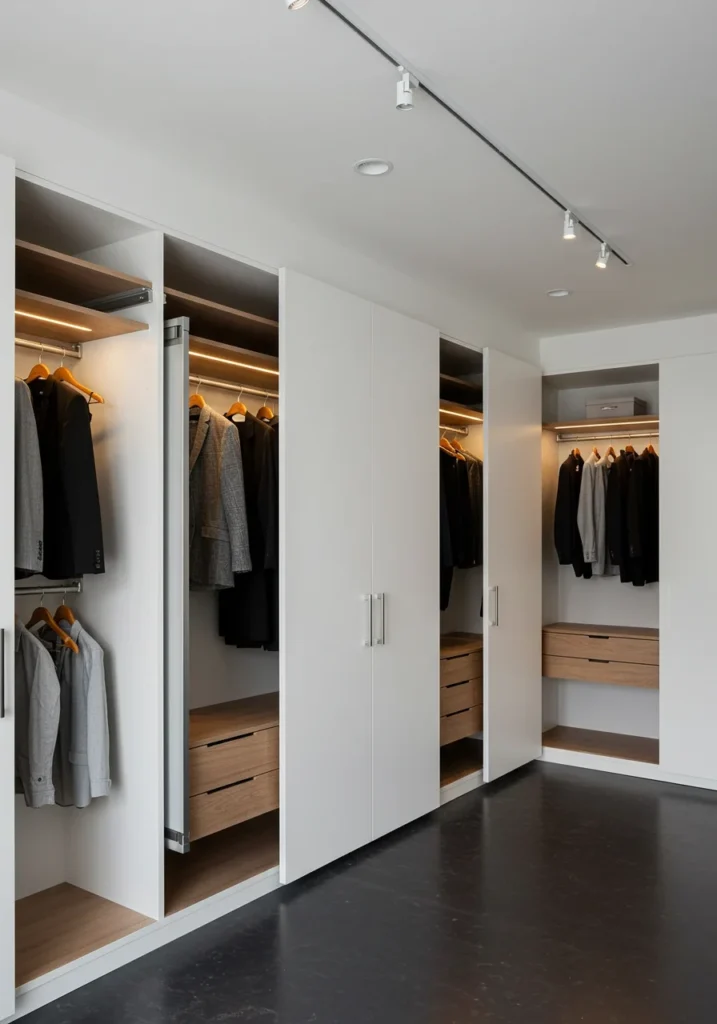 A built-in wardrobe with vertical pull-down hanging rails is designed to maximize vertical storage in small bedrooms. This clever system allows you to use higher sections of the closet without struggling to reach them. With a simple pull-down mechanism, clothes can be lowered for easy access and pushed back up when not in use. This makes it possible to double your hanging space, particularly for longer garments or seasonal clothing. The built-in design ensures a sleek, custom fit that blends seamlessly with the bedroom’s architecture. Inside, the closet can also include drawers, shelves, and shoe racks for a complete storage solution. By utilizing the full height of the room, this design keeps clutter off the floor while maintaining a clean, organized look. Ideal for compact spaces, vertical pull-down rails make closets more functional and ergonomic. They combine smart engineering with sleek style, transforming even the smallest bedrooms into efficient, well-organized spaces.