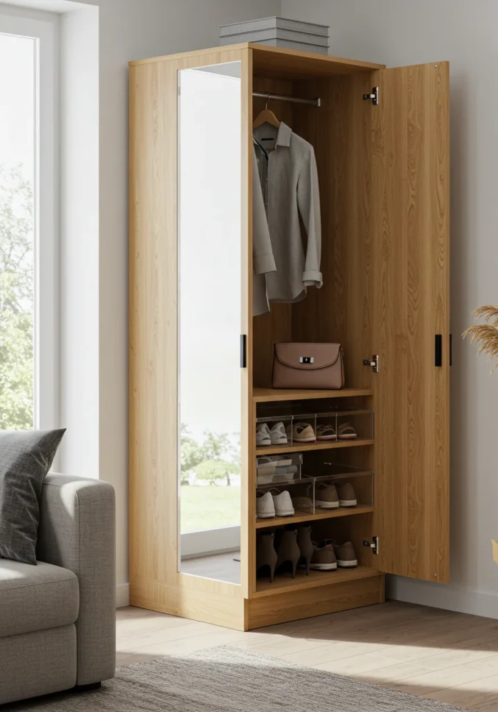 Scandinavian-inspired compact wardrobe with light wood finishes