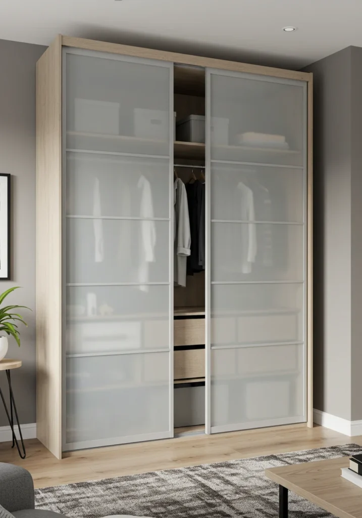 A compact sliding wardrobe with frosted glass panels is a contemporary storage solution that balances privacy with style. The sliding mechanism saves floor space, making it ideal for small bedrooms where swing doors aren’t practical. Frosted glass provides a soft, translucent effect that hides clutter while still maintaining an airy, light-filled atmosphere. This design adds sophistication without overwhelming the room, blending seamlessly into minimalist or modern interiors. Inside, the wardrobe can be fitted with customizable shelving, drawers, and hanging rods, ensuring efficient organization. The frosted panels also prevent the closet from feeling bulky or heavy, creating a sleek, streamlined look. For added elegance, aluminum or wood frames can be chosen to complement the overall décor. Compact yet functional, this type of wardrobe provides all the storage you need without compromising on style. A sliding wardrobe with frosted glass panels is the perfect combination of practicality and elegance for small-space living.