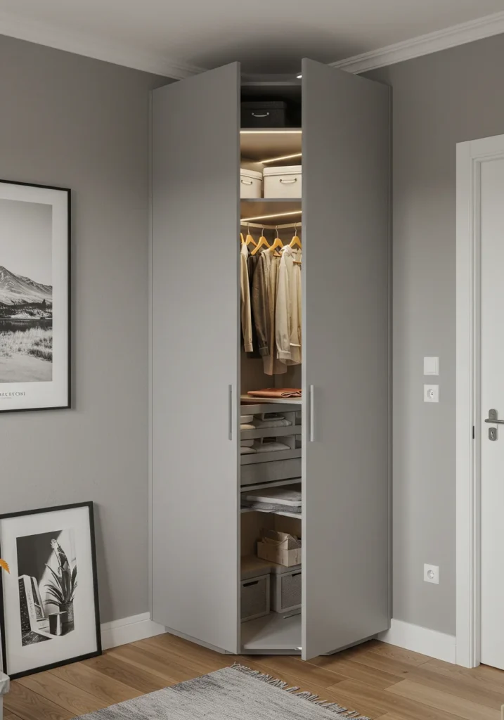 A hidden rotating wardrobe is an ingenious way to make the most of corner spaces in small bedrooms. Designed with a pivoting mechanism, it allows sections of the closet to rotate, revealing different compartments without requiring extra floor space. This smart design transforms otherwise awkward corners into fully functional storage, accommodating clothing, shoes, and accessories with ease. The rotating function makes it simple to access everything quickly, eliminating the struggle of deep or unreachable shelves. Externally, the wardrobe can be disguised with sleek panels or mirrored doors to blend into the room seamlessly. Some modern designs even integrate lighting and soft-close technology, making the experience luxurious despite the compact footprint. Perfect for apartments or rooms where every inch counts, a rotating wardrobe combines innovation with practicality. Its hidden nature adds a minimalist, uncluttered appeal, ensuring the room feels open and spacious. By turning wasted corners into clever storage, this design offers both convenience and contemporary style.