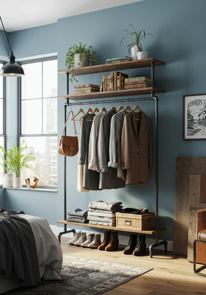 An industrial-style open rack closet combines functionality with edgy, urban aesthetics, making it a trendy choice for small bedrooms. Featuring black metal frames paired with wooden shelves, this design offers a raw, minimalist vibe while maximizing storage. The open format allows clothing, shoes, and accessories to remain visible and easily accessible, encouraging intentional organization. Its slim, vertical structure works well in tight spaces, providing storage without overwhelming the room. Wooden accents bring warmth, balancing the industrial feel and ensuring the design remains stylish rather than stark. Many open rack systems are modular, allowing you to add or remove shelves as needed. This makes it a flexible choice for evolving storage needs. Because the closet doubles as décor, you can display favorite pieces, shoes, or accessories to personalize the space. Perfect for loft apartments or modern small bedrooms, an industrial-style open rack closet blends practicality with trendy design, making storage part of the room’s character.