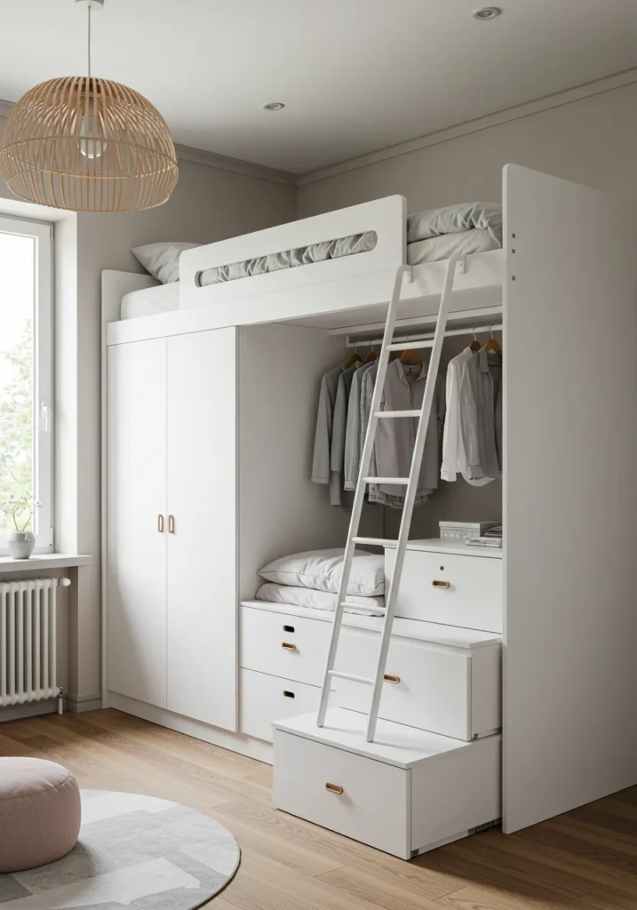 A loft bed with a built-in wardrobe underneath is a game-changing solution for small bedrooms, especially for teens, kids, or studio apartments. By elevating the bed, the design frees up valuable floor space for storage directly below. The built-in wardrobe can include hanging rods, drawers, shelves, and even shoe storage, tailored to your needs. Some designs also incorporate desks, seating areas, or bookcases, making the setup multifunctional. This space-saving approach is perfect for maximizing vertical space in compact rooms, turning one piece of furniture into a complete living solution. Loft beds with wardrobes often come in sleek modern finishes, rustic wood styles, or minimalist designs, allowing them to suit various aesthetics. Not only does this design provide ample storage, but it also creates a fun, unique layout that feels open and practical. A loft bed with a wardrobe underneath is ideal for maximizing space while keeping the bedroom organized and stylish.
