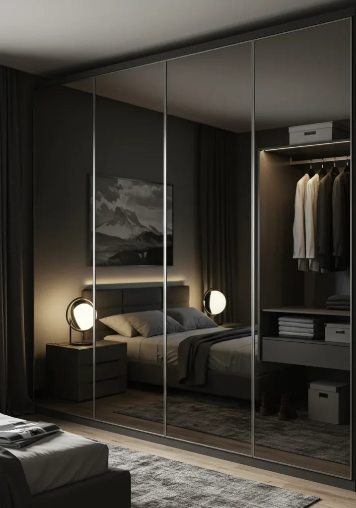 A modern mirrored wardrobe is both functional and decorative, making it a perfect addition to small bedrooms. The mirrored surface reflects light and space, instantly making the room feel brighter and more expansive. This dual-purpose design means you don’t need a separate full-length mirror, saving even more floor space. Inside, the wardrobe can be fitted with customizable shelving, drawers, and rods to maximize organization. Mirrored wardrobes come in a variety of styles, from frameless sliding doors for a minimalist look to framed panels that add sophistication. The reflective surfaces also enhance the aesthetic appeal of the bedroom, serving as a design feature while keeping clutter hidden. For added convenience, some modern versions integrate LED lighting behind the mirrors, providing both ambiance and functionality. Perfect for contemporary, minimalist, or glam-inspired bedrooms, mirrored wardrobes transform storage into a chic centerpiece. They combine practicality and elegance, ensuring small bedrooms feel spacious, stylish, and perfectly organized.