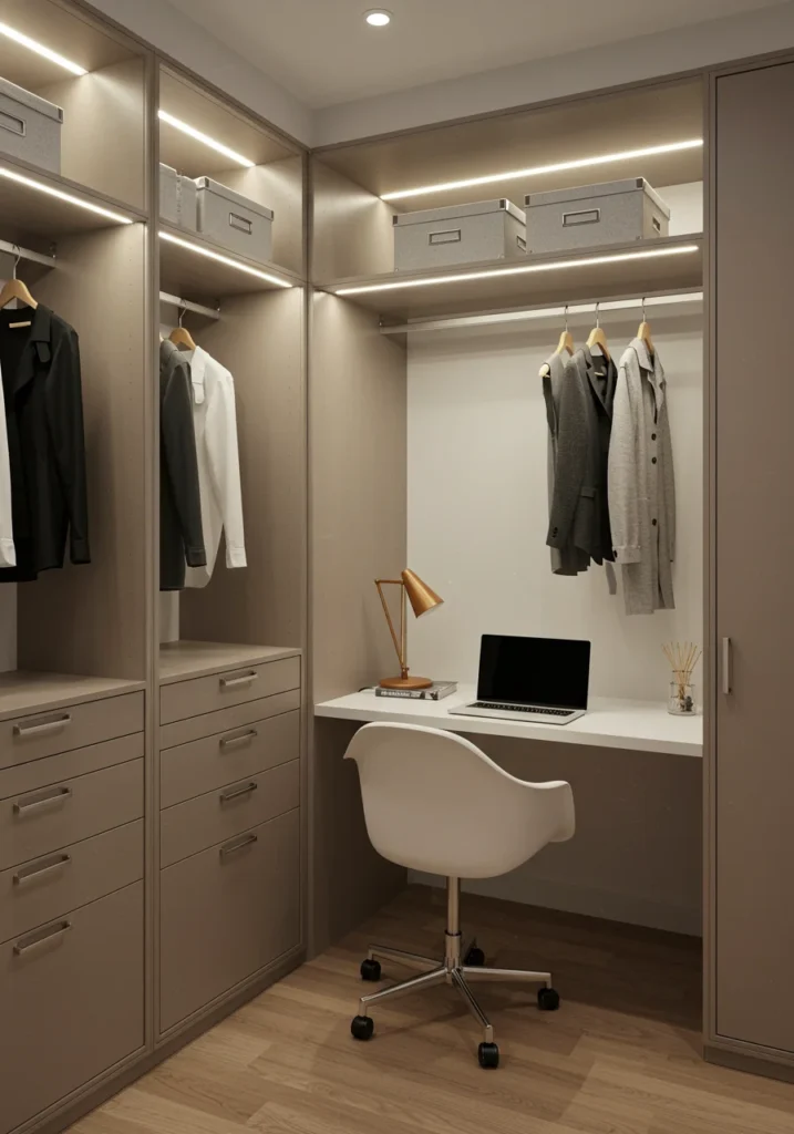 A multi-functional closet with a built-in desk is a clever way to maximize utility in small bedrooms. This hybrid design combines wardrobe storage with a dedicated workspace, making it perfect for students, remote workers, or anyone who needs a compact office setup. Typically, the closet is arranged with hanging rods and shelving on one side and a desk area integrated on the other. Overhead cabinets and drawers can provide extra storage for clothing, books, or office supplies, ensuring everything has its place. This dual-purpose design eliminates the need for separate furniture, saving valuable floor space while keeping the room organized. For modern aesthetics, sleek finishes and clean lines ensure the closet-desk combination blends seamlessly into the bedroom’s style. Task lighting can be added to the desk area, while closet sections can be fitted with organizers for efficiency. Practical, stylish, and space-conscious, a multi-functional closet with desk space transforms small bedrooms into versatile living environments without compromising comfort or design.