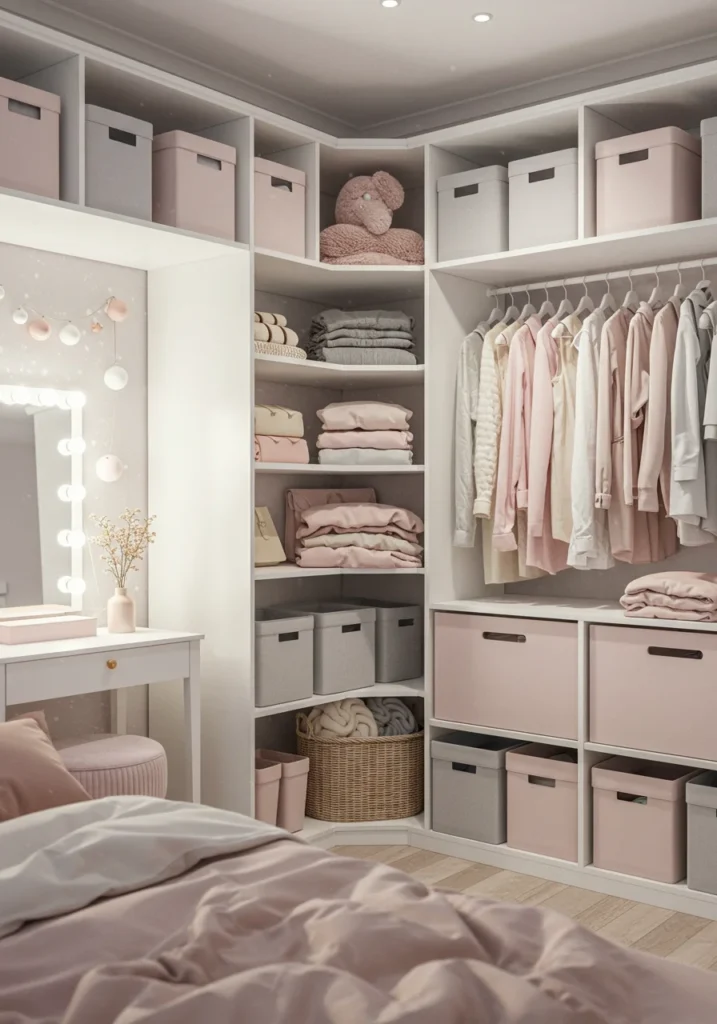 A built-in corner closet transforms often overlooked bedroom corners into highly functional storage spaces. Perfect for small bedrooms, this design maximizes every inch by fitting neatly into unused areas. Custom drawers, shelves, and hanging rods can be tailored to your specific needs—whether for folded clothes, accessories, or long garments. By extending vertically, you can also incorporate overhead cabinets to make use of the full height of the room. A built-in approach ensures the closet blends seamlessly with existing architecture, creating a polished and intentional look. Doors can be sleek and flush for a modern touch, or open shelving can be chosen for a more casual, airy vibe. This type of closet works especially well in awkwardly shaped bedrooms where standard wardrobes don’t fit. It not only improves storage capacity but also keeps clutter tucked away, giving the room a streamlined, spacious feel. A corner closet is an excellent example of form meeting function in small-space living.