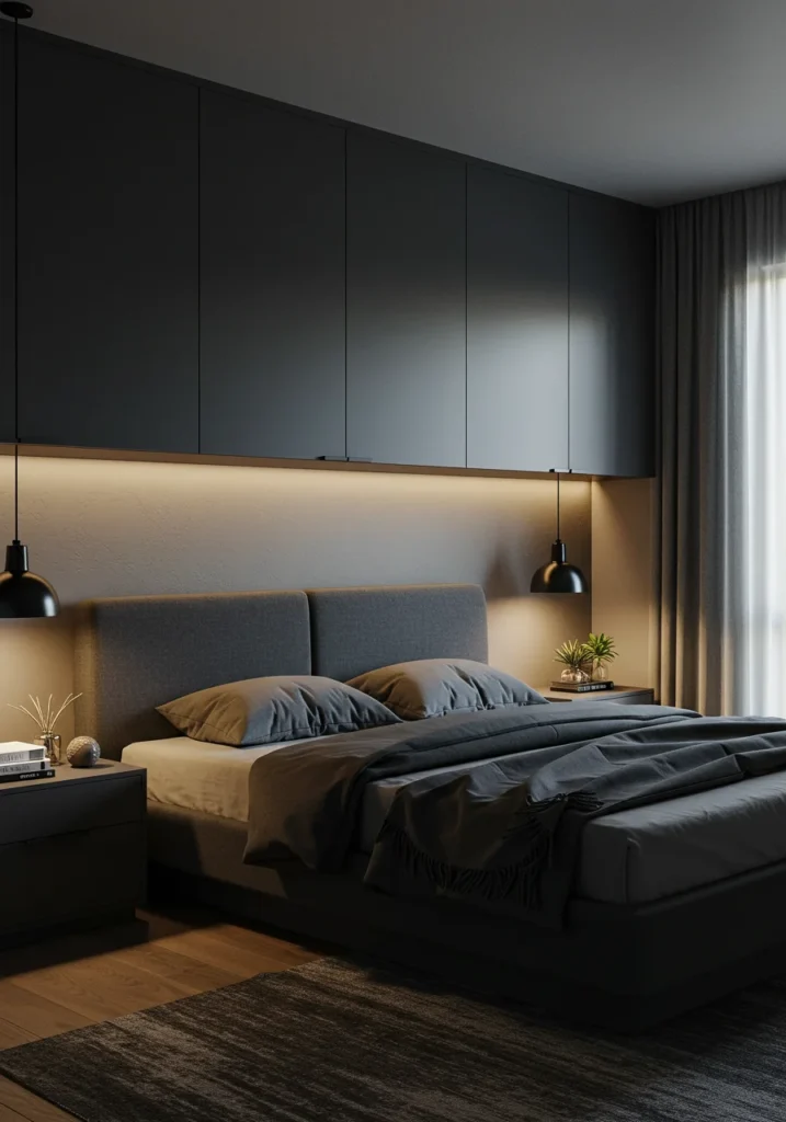 Overhead closet cabinets above the bed are a clever way to maximize vertical space in small bedrooms. By installing storage units directly over the headboard wall, you create a convenient spot for clothing, bedding, or seasonal items without using extra floor space. The cabinets can be designed with sleek, modern finishes to blend seamlessly with the room’s décor, or styled with wood tones for warmth. To prevent the design from feeling heavy, open shelving or decorative cubbies can be incorporated alongside the cabinets. This setup not only increases storage but also frames the bed, giving the room a built-in, custom look. Soft-close hinges and integrated lighting add both practicality and a polished feel. For those worried about accessibility, the cabinets can be paired with step stools or designed with pull-down mechanisms. Especially useful in studio apartments or compact bedrooms, overhead storage transforms unused wall space into a highly functional closet alternative. Stylish and discreet, it’s a practical solution that enhances both organization and aesthetics.