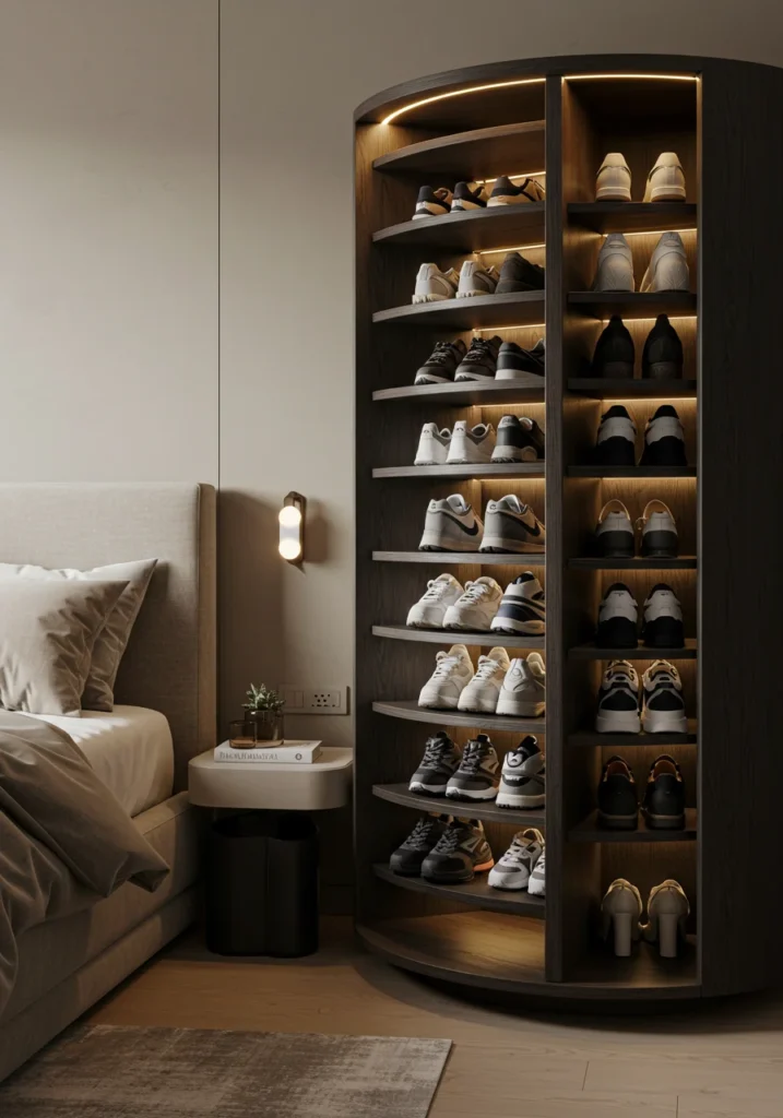 A rotating shoe carousel closet is a game-changer for small bedrooms with limited floor space. This innovative design uses a vertical rotating mechanism—similar to a lazy Susan—that allows shoes to be stored neatly while remaining easily accessible. The carousel can fit within a narrow wardrobe, corner nook, or even under-stair storage, making it highly space-efficient. Each tier rotates smoothly, ensuring no pair is hidden or difficult to reach. Some designs include adjustable tiers to accommodate boots, heels, or sneakers, while others integrate ventilation features to keep footwear fresh. This system not only saves space but also keeps the closet visually organized, eliminating messy shoe piles. Modern versions can be built with sleek finishes and even LED lighting for a high-end touch. A rotating shoe carousel is especially useful for fashion lovers who want their collection accessible without overwhelming the room. Compact, stylish, and practical, it transforms small-bedroom storage into an efficient, boutique-inspired experience.