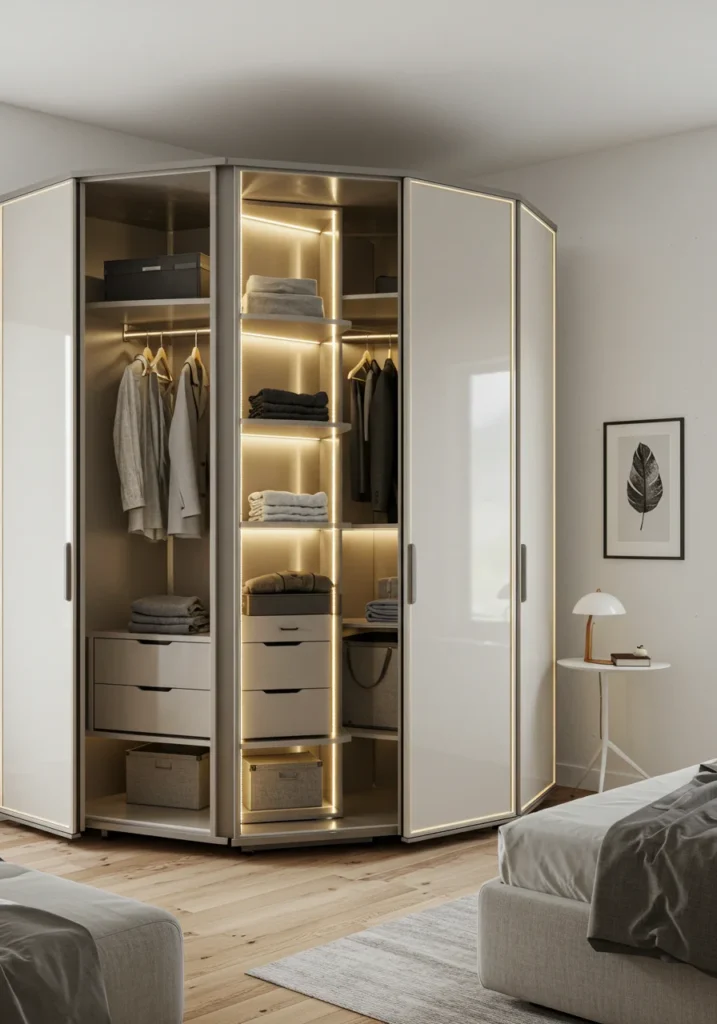 A rotating wardrobe carousel is a highly innovative storage solution designed specifically for compact bedrooms. Instead of traditional fixed shelves or rods, this closet incorporates a rotating system that allows you to access all your clothing with a simple spin. This design maximizes storage in tight spaces by utilizing depth efficiently while keeping everything organized and easily accessible. Carousels can be customized to include hanging sections, shoe racks, and accessory compartments, making them a comprehensive storage unit. The rotating mechanism eliminates the need for wide door clearances or multiple storage areas, saving valuable floor space. With sleek finishes and modern engineering, a rotating wardrobe carousel also adds a futuristic, high-end touch to the bedroom. Ideal for small apartments or tiny homes, this system brings convenience, efficiency, and a sense of luxury to everyday storage. Compact yet highly functional, a rotating wardrobe transforms limited bedroom space into an organized, stylish, and innovative environment.