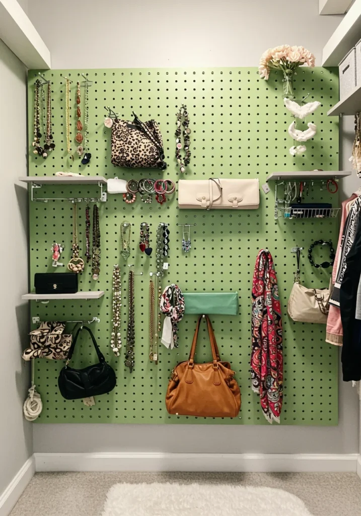 A small space closet with pegboard walls is a versatile and customizable storage solution perfect for organizing accessories in compact bedrooms. Pegboards allow you to easily hang and rearrange hooks, baskets, and shelves, making the system highly adaptable. Scarves, jewelry, handbags, hats, and even shoes can be neatly displayed and accessed without taking up extra shelf or drawer space. This design is especially useful for maximizing vertical walls inside a closet or wardrobe, ensuring no space goes unused. Pegboards can be painted to match your décor, adding a pop of color or blending seamlessly with the closet interior. They also keep smaller items from getting lost, maintaining order and reducing clutter. Lightweight and affordable, pegboard systems are renter-friendly and easy to install. By creating a visually organized layout, they transform accessories into part of the décor. Functional, stylish, and endlessly adaptable, pegboard walls elevate small-space closets into highly efficient and personalized storage zones.
