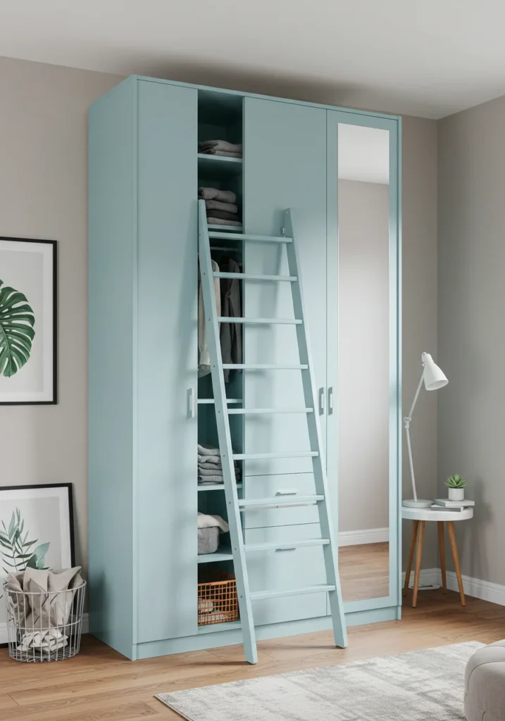 A tall wardrobe with ladder access takes full advantage of vertical space in small bedrooms, offering ample storage without consuming valuable floor area. By extending the wardrobe to the ceiling, you can store out-of-season clothing, extra bedding, or items you don’t use daily at the top, while keeping essentials at eye level. A slim ladder, either foldable or sliding on a track, provides access to higher shelves in a stylish and practical way. This design mirrors the charm of a library ladder, adding sophistication to the bedroom while solving storage challenges. Inside the wardrobe, adjustable rods, drawers, and compartments keep clothing and accessories neatly organized. Sleek finishes and tall, elegant proportions make the wardrobe a striking focal point. Ideal for small apartments or compact homes, this design makes every inch of vertical space useful while maintaining a clean, streamlined appearance. A tall wardrobe with ladder access is a smart, stylish, and functional choice for small bedrooms.