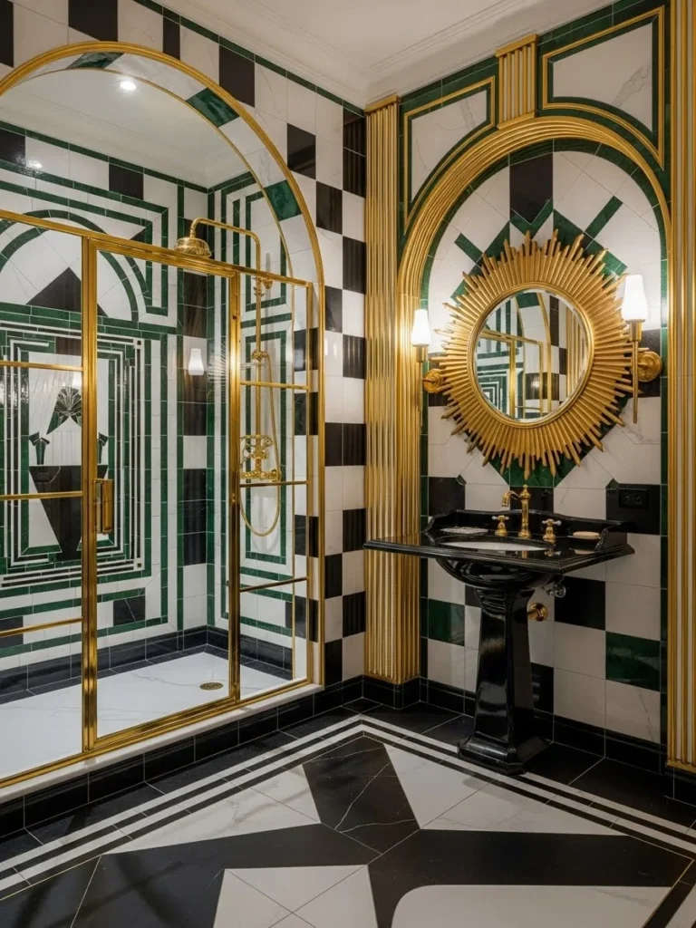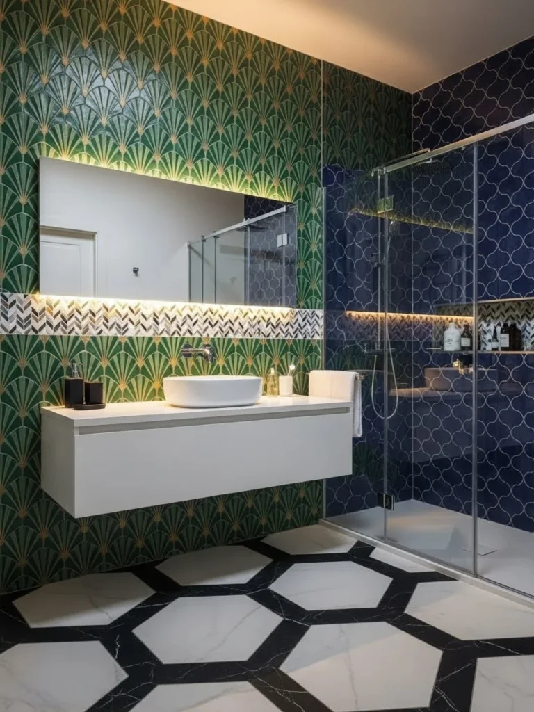 Art Deco bathroom tile designs capture the glamour and sophistication of the early twentieth century while offering timeless elegance for modern interiors. Characterized by geometric patterns, rich colors, and luxurious finishes, these designs instantly elevate the bathroom into a refined, statement-making space. Tiles incorporating bold lines, fan motifs, and symmetrical layouts create a dramatic architectural presence.