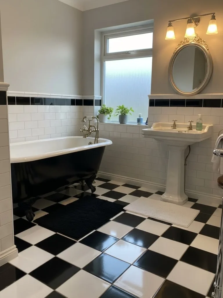 Checkerboard tiles are also exceptionally versatile, pairing effortlessly with chrome, brass, or matte black fixtures. The timeless palette ensures long-term relevance and easy coordination with future décor updates. Whether used in historic homes or contemporary renovations, black and white checkerboard tile enhances bathroom interiors with sophistication, balance, and enduring style.