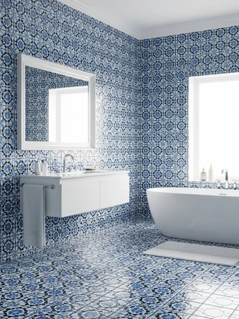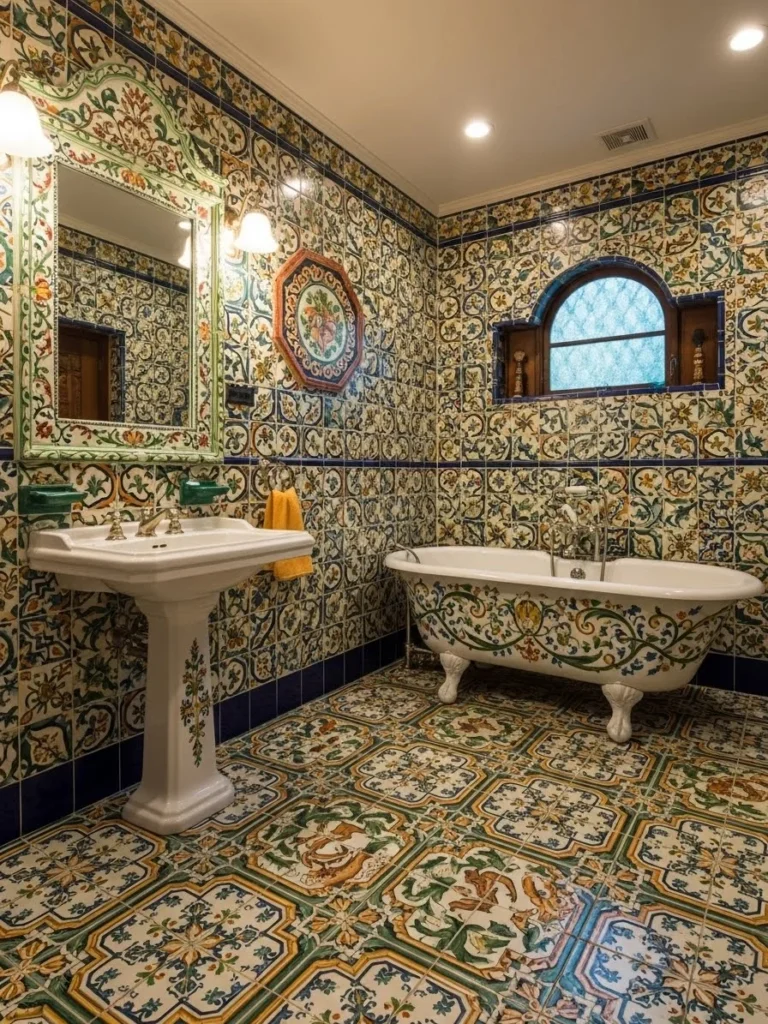 Victorian-style tiles are often used to create elaborate floor designs, feature walls, or decorative wainscoting that highlight craftsmanship and detail. Pairing these motifs with clawfoot tubs, brass hardware, and traditional lighting further reinforces the period-inspired aesthetic. Soft pastels, deep jewel tones, and muted neutrals all complement the ornate patterns beautifully.
