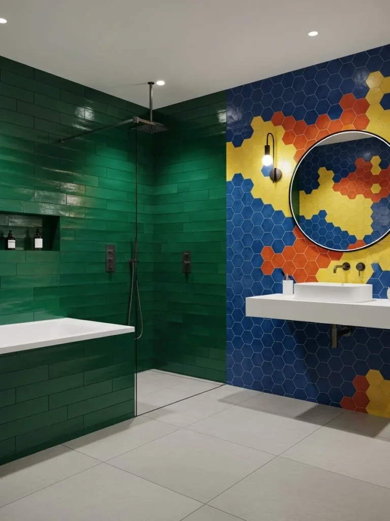 Boldly colored bathroom tiles are increasingly used to create dynamic, attention-grabbing interiors. Bright blues, deep greens, rich reds, and vibrant yellows inject personality and energy into bathrooms, transforming functional spaces into expressive design statements. Colorful tiles allow homeowners to experiment with creativity while highlighting architectural features or focal points.