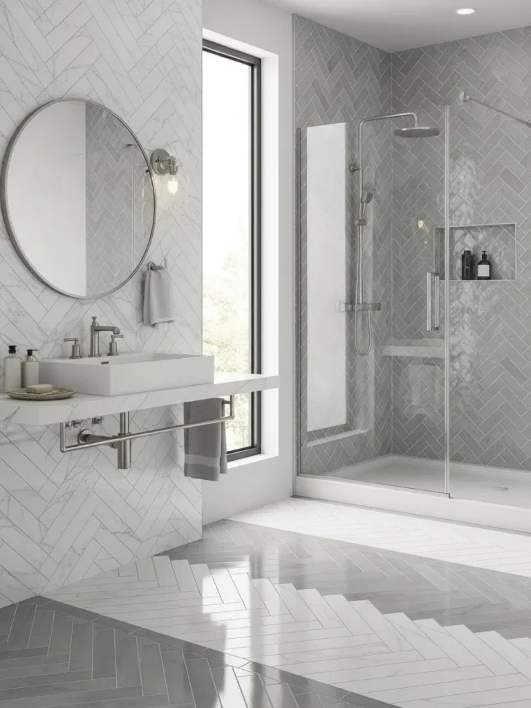 Designers often use these layouts with wood-look, marble, or ceramic tiles to enhance texture and depth. Chevron patterns direct the eye along a linear path, creating a sense of height or elongation, while herringbone offers a classic, woven effect. Accent walls, shower areas, or floors are ideal locations for these patterns, adding dimension without overwhelming the space.