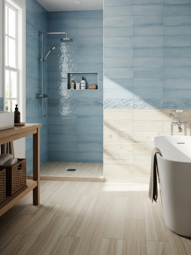 Coastal-style bathrooms draw inspiration from serene seaside landscapes, using soft blue and sandy beige tiles to evoke a calm, refreshing ambiance. These tones mimic ocean waters, warm sands, and breezy shorelines, making them ideal for creating a relaxing retreat within the home. Light-reflective surfaces and subtle textures contribute to a tranquil, airy aesthetic.