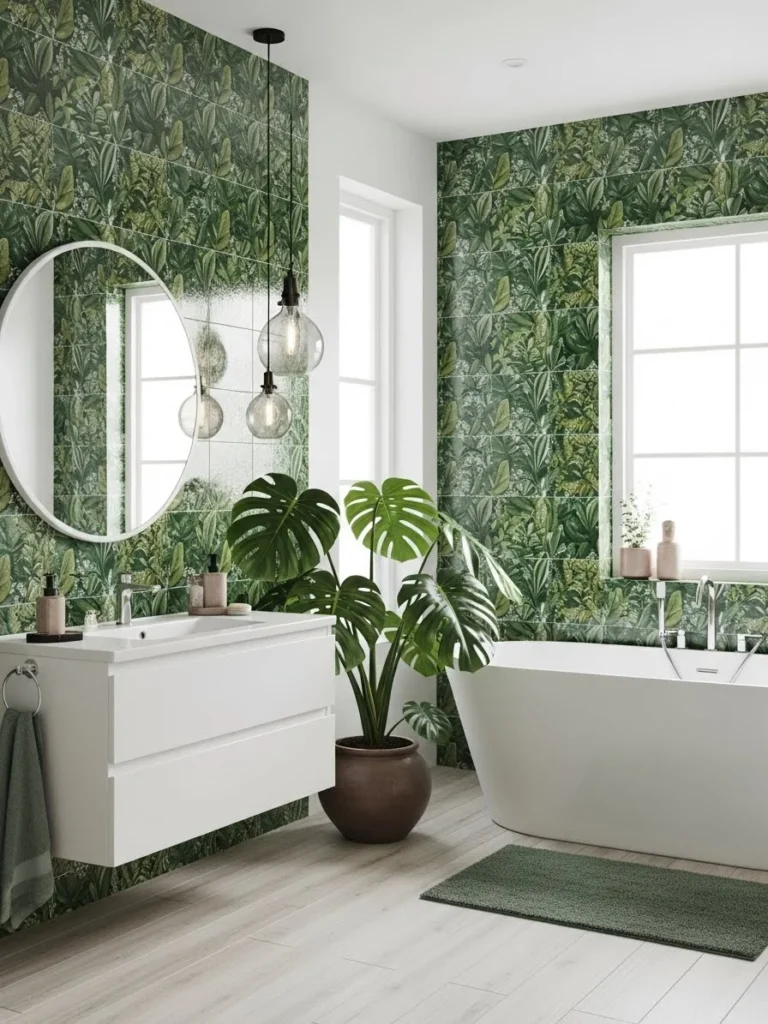 Botanical-inspired tiles often feature subtle patterns, natural textures, or glazed finishes that mimic leafy foliage or organic materials. Designers frequently pair green tiles with wood accents, stone surfaces, and matte black or brass fixtures to create an earthy, balanced palette. Whether used as a feature wall, shower backdrop, or flooring element, green tiles add both vibrancy and elegance.