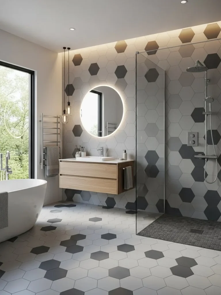 Hexagon tiles have become a standout feature in modern bathroom design due to their geometric elegance and versatility. Their six-sided shape introduces visual interest and contemporary structure, making them ideal for both subtle enhancements and bold statement features. Available in a wide range of colors, finishes, and sizes, hexagon tiles fit effortlessly into various design styles.