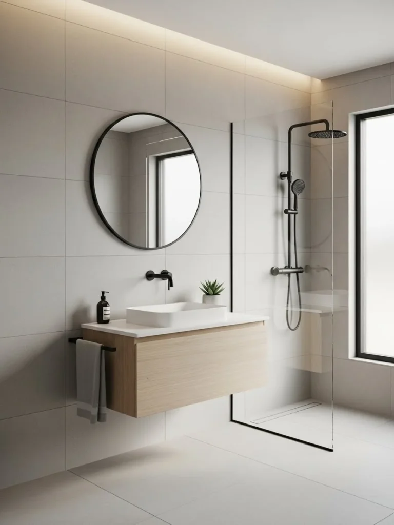 Matte black accents elevate minimalist compositions by introducing bold contrast without overwhelming the room. Whether used in tile trims, shower niches, or floor patterns, matte black brings depth and sophistication. This accent color pairs exceptionally well with white, gray, or beige tiles, achieving a refined, gallery-like aesthetic that feels intentional and modern.