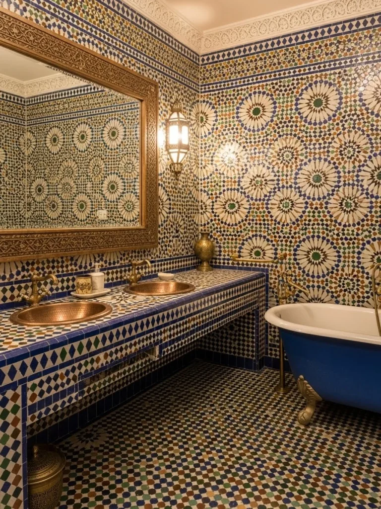 12. Moroccan zellige bathroom tile ideas with handmade textures