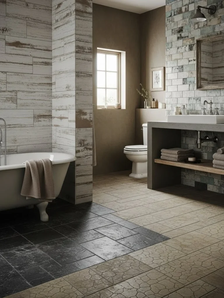 20. Rustic farmhouse bathroom tile inspiration using distressed textures