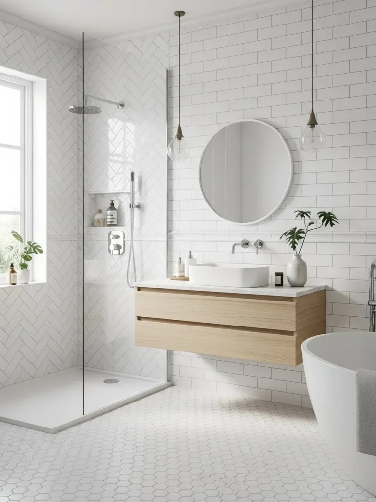 Designers often combine white tiles with pale wood accents, matte black fixtures, and soft, neutral textiles to add contrast and warmth. Subtle textures—such as ribbed, matte, or handcrafted ceramic finishes—introduce depth without compromising the minimalist style. The result is a balanced environment that feels both modern and inviting.