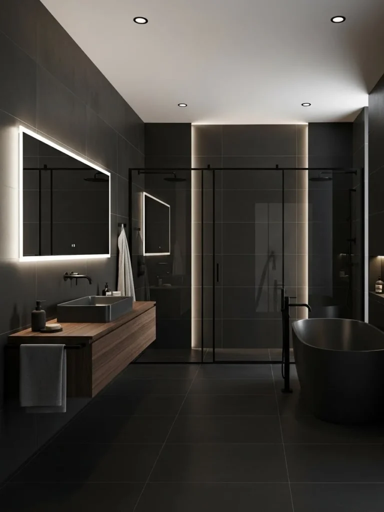 01. Modern minimalist bathroom tile ideas with matte black accents