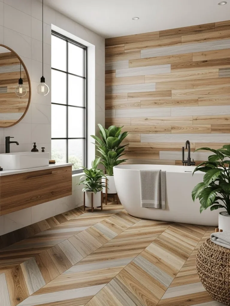 Designers often incorporate wood-look tiles on floors, walls, or vanity surrounds to establish continuity and a natural aesthetic. Pairing them with neutral tones, soft lighting, and minimalistic fixtures enhances the feeling of warmth and relaxation. These tiles also harmonize beautifully with natural stone, matte black fittings, and green accents to create layered, nature-inspired interiors.
