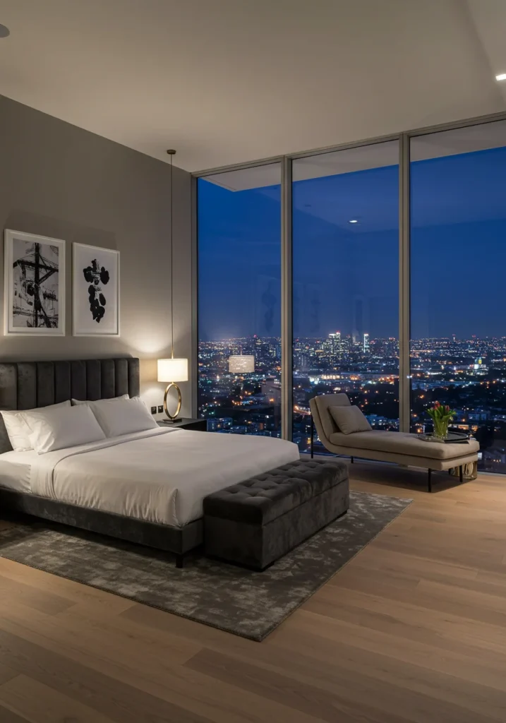Mood lighting enhances the evening experience — recessed LEDs and pendant lamps add depth without detracting from the skyline. A statement headboard or sculptural light fixture grounds the space, while accent colors like charcoal, gold, or deep blue add personality. Every detail is curated to complement the view rather than compete with it, making this bedroom a serene, elevated retreat above the bustle of city life.
