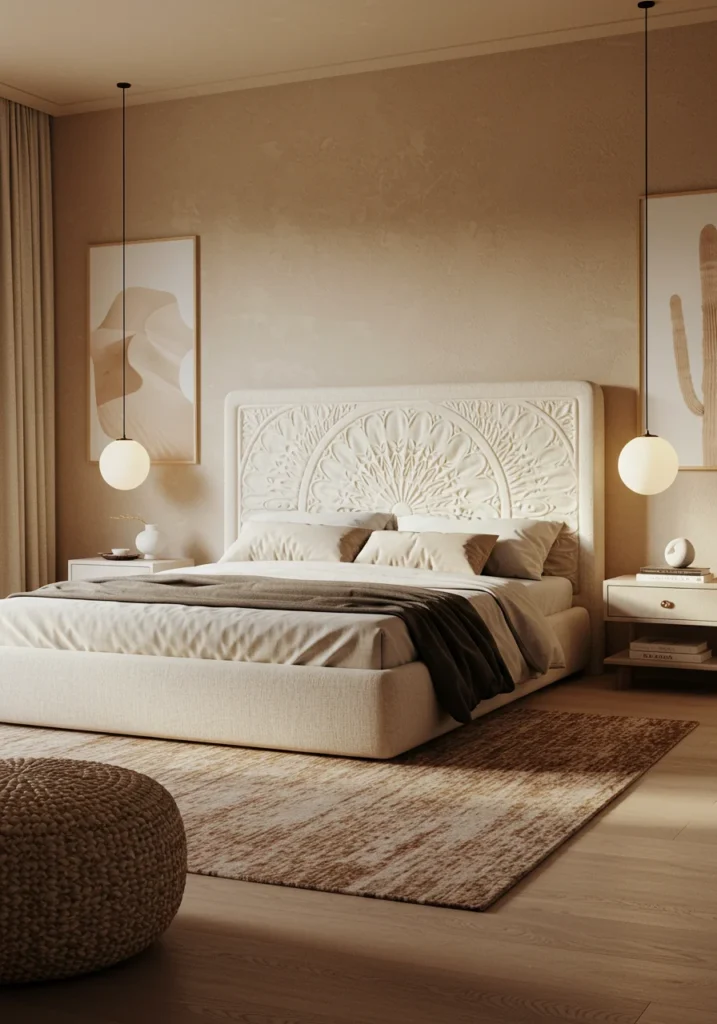 Desert-Inspired Luxury Bedroom with Earthy Textures and Beige Palette