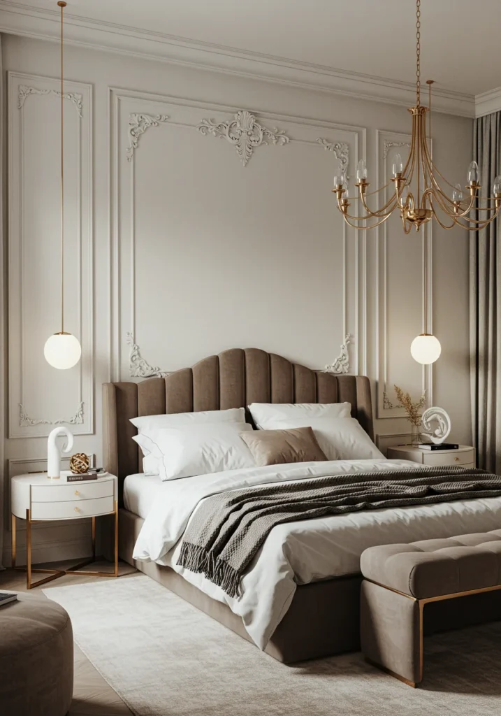 Gold or bronze fixtures, sculptural lamps, and abstract art elevate the restrained palette. Hidden lighting accentuates the molding, giving dimension and warmth. This bedroom proves that luxury doesn’t require excess—just balance, craftsmanship, and a timeless eye for detail.